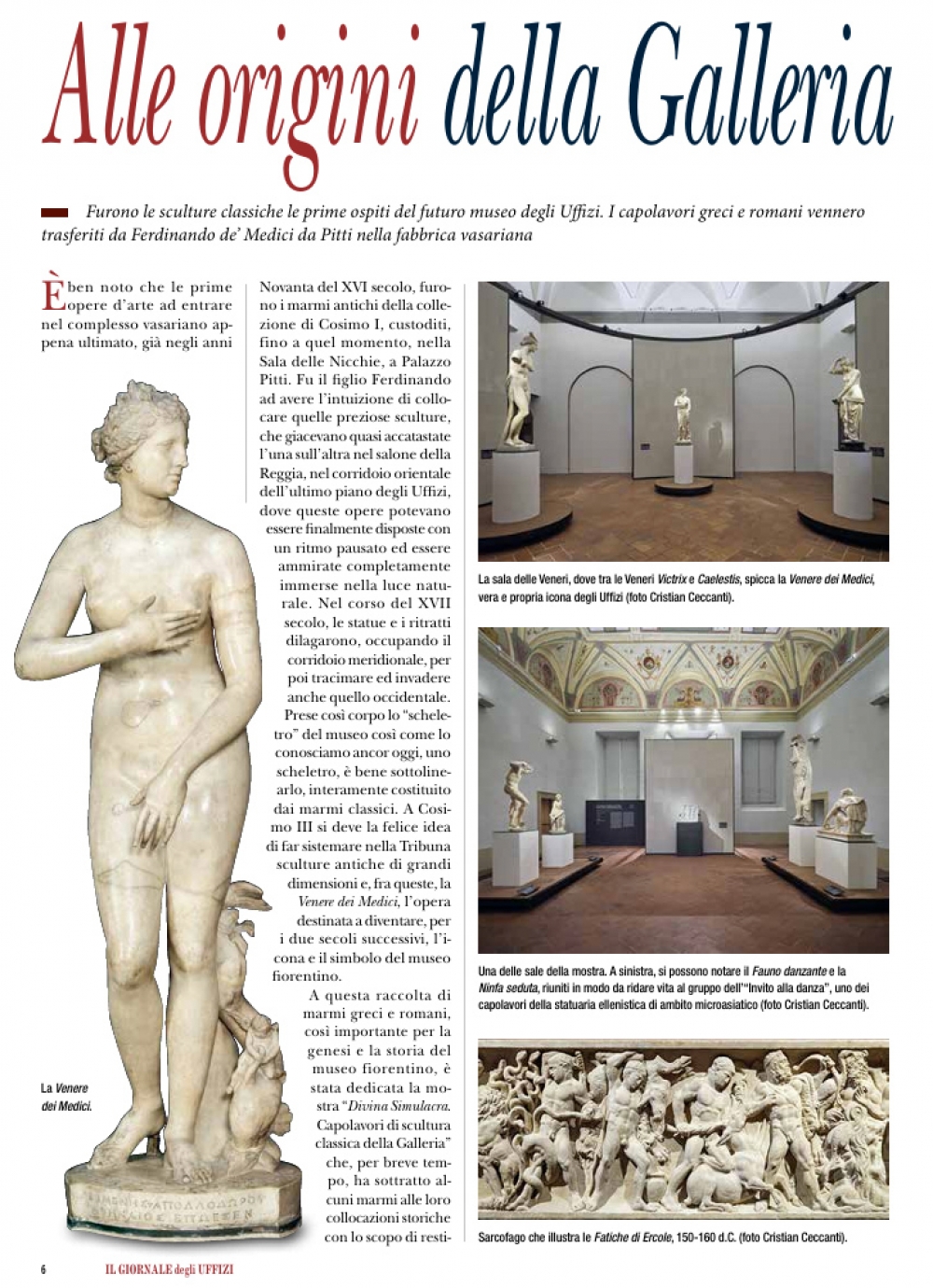 È noto che le prime opere d’arte ad entrare nel complesso vasariano appena ultimato, già negli anni Ottanta del XVI secolo, furono i marmi antichi della collezione di Cosimo I, custoditi fino a quel momento in Palazzo Pitti. Si deve a Ferdinando I l’intuizione di collocare le preziose sculture nel corridoio orientale dell’ultimo piano, dove potevano essere ammirate completamente immerse nella luce naturale. Nel corso del XVII secolo, le statue e i ritratti dilagarono occupando il corridoio meridionale e, con il regno di Cosimo III, anche quello occidentale. A Cosimo III si deve anche l’intuizione di far sistemare nella Tribuna sculture antiche di grandi dimensioni. Fra queste vi era la Venere dei Medici, destinata a diventare, per i due secoli successivi, l’icona e il simbolo del museo fiorentino.